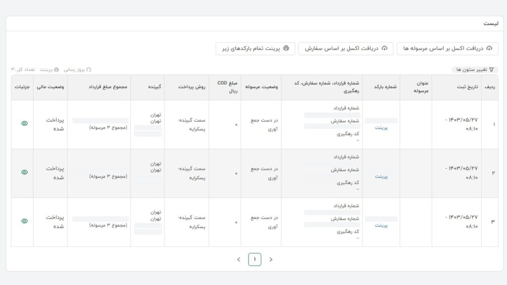 با استفاده از این قابلیت، میتوانید پس از جستجو و انتخاب بستههای موردنظر، بارکد آنها را بهصورت گروهی چاپ گرفته و روی بستههای خود بچسبانید. استفاده از این ویژگی میتواند سرعت آمادهسازی سفارشها را در کسبوکارها افزایش دهد.
